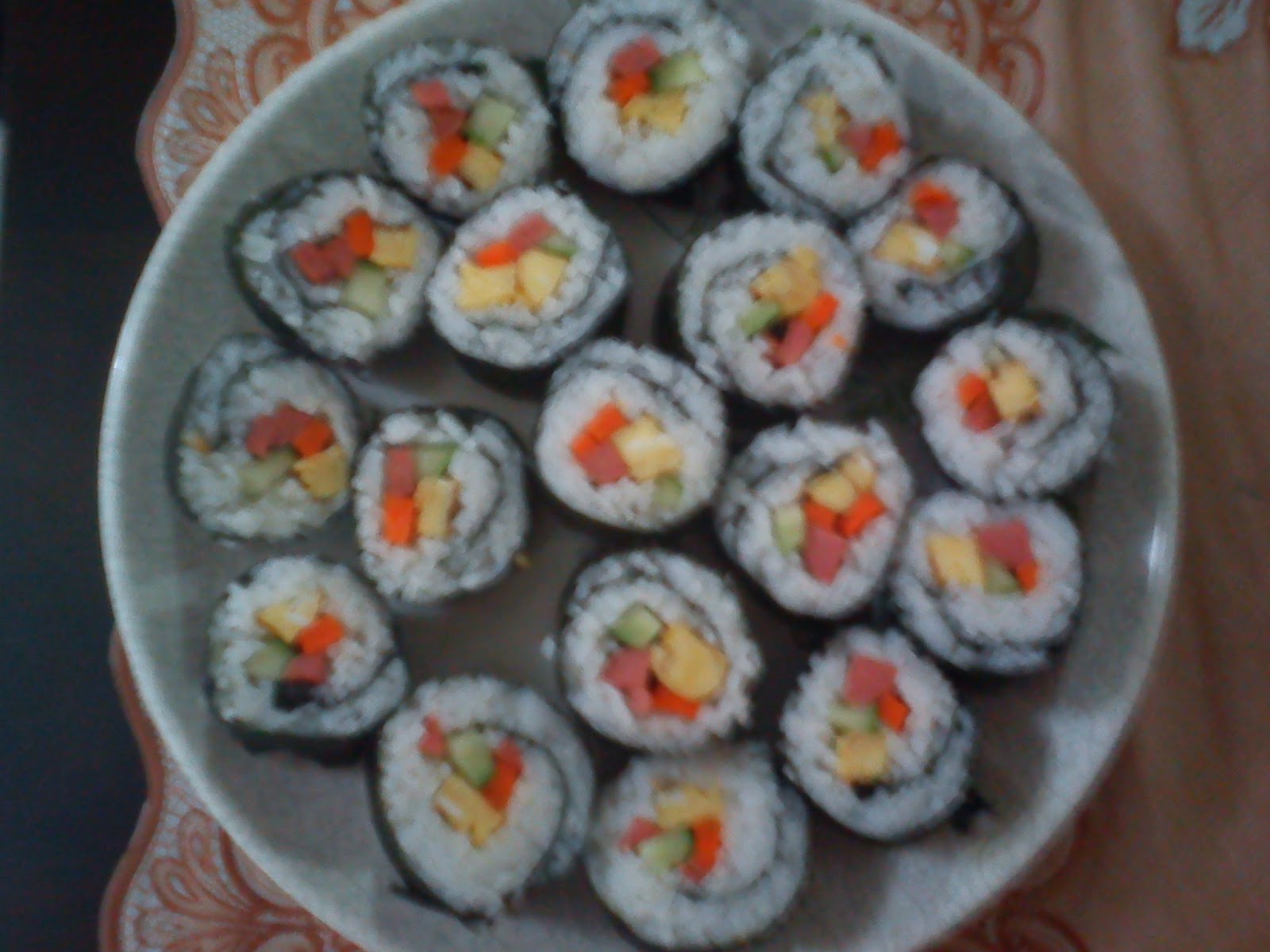 | timun, carrot, sosej, omelet, nasi panas, seaweed. |